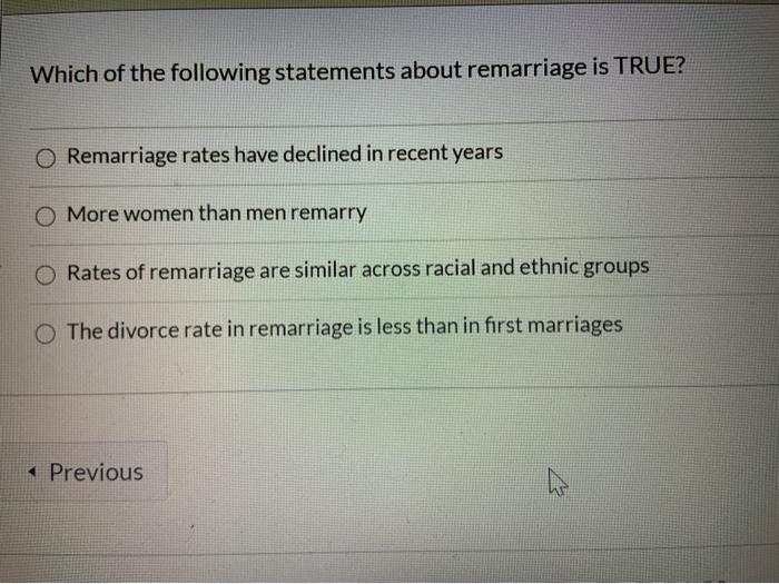 Solved Which Of The Following Statements About Remarriage Is Chegg Com